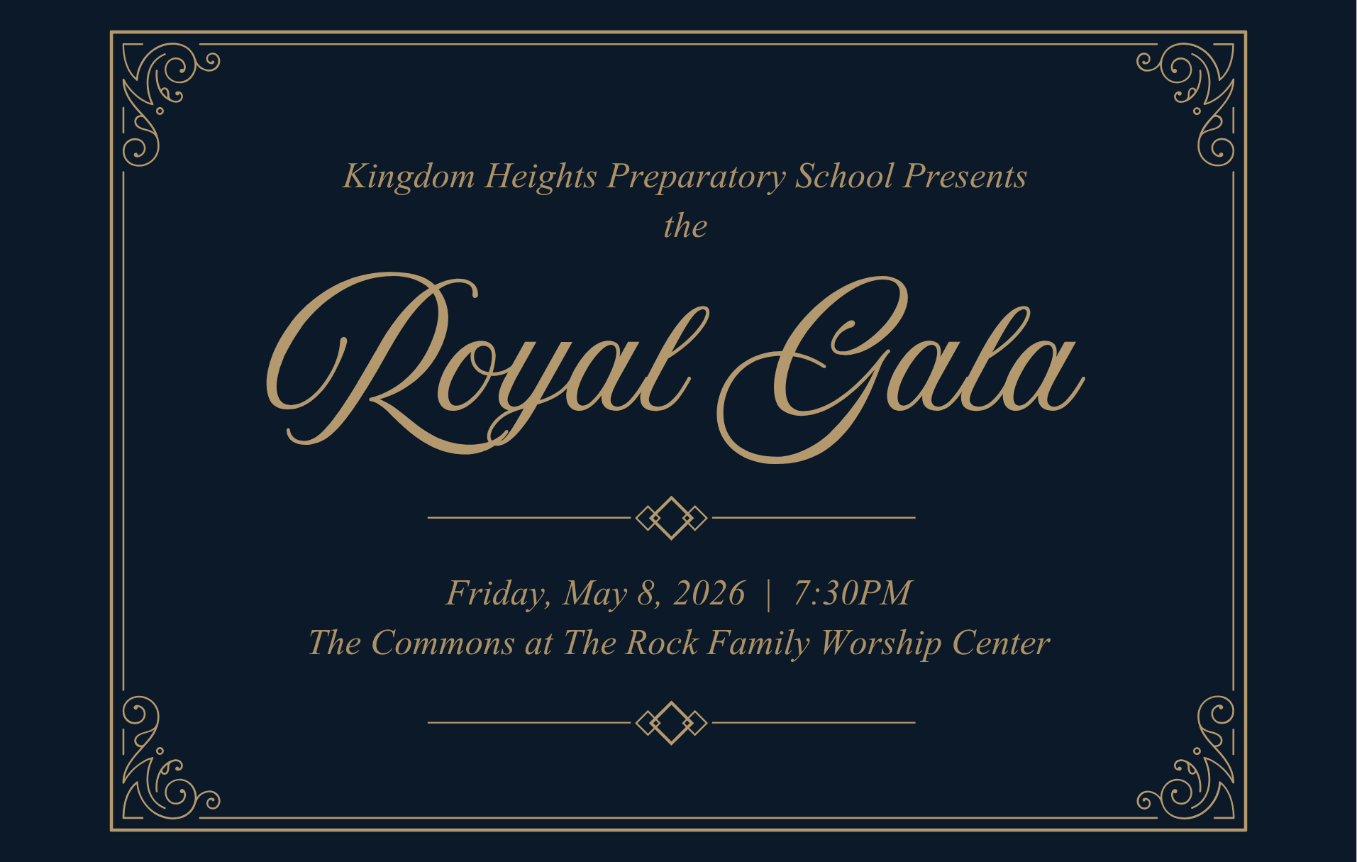 We cordially invite all Kingdom Heights 8th–12th grade students to join us at this year’s 'Royal Gala,' happening Friday, May 8, 2026, at 7:30 PM in The Commons of the Rock Family Worship Center. Formal attire is required. Tickets are $40 per student.